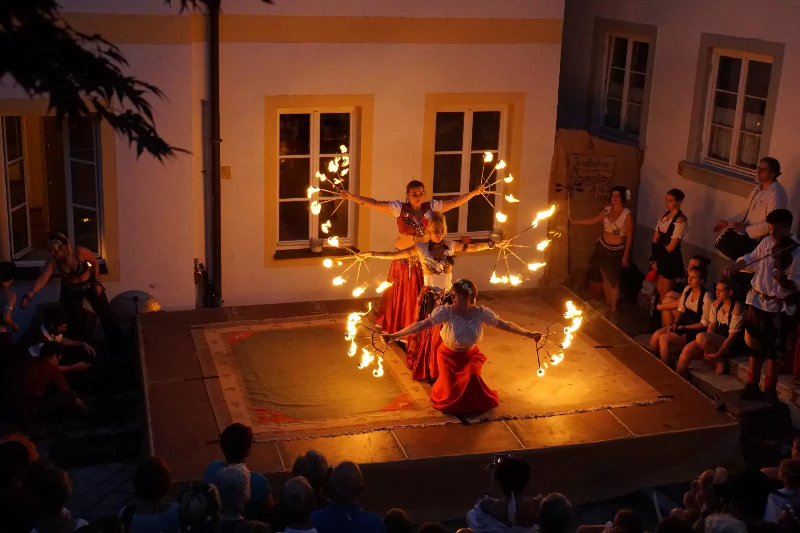 Mit stimmungsvollen Flammentänzen zeigt Mystica Osmanicae ein buntes Programm und verführt ihre Gäste in ein Reich der Poesie und Romantik. Begleitend von Geige und Schalmei sowie verschiedenen Trommeln verzaubern Sie Ihre Zuschauer mit Feuertanz, Trommeley und Akrobatik.