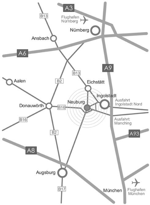 Fahren Sie an der Ausfahrt Manching von der Autobahn ab und biegen dann auf die Bundesstrasse B16 Richtung Neuburg ab. Benutzen Sie bitte die P + R Parkplätze und steigen Sie auf die Pendelbusse um.